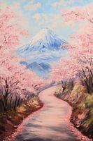 Een rustige weg baant zich een weg door een magisch landschap, omlijst door bloeiende kersenbomen in een delicate roze kleur. Een besneeuwde top rijst majestueus op in de achtergrond en kust de hemel met zijn stralende blauwe kleur. De harmonieuze kleurenzee belooft een vredige reis door de natuur terwijl de lente haar betoverende…
