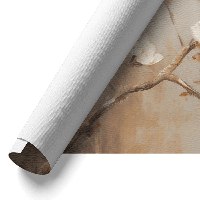Afbeelding van een witte kersenbloesem op een achtergrond van bruin, goud, beige, grijs en wit. Witte bloemen en witte knopjes, verfijnd. Passend bij diverse stijlen, waaronder natuurlijk en Japandi.