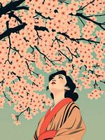 Een gestileerde illustratie van een vrouw in traditionele Japanse kleding die opkijkt naar bloeiende kersenbloesemtakken tegen een lichte achtergrond.