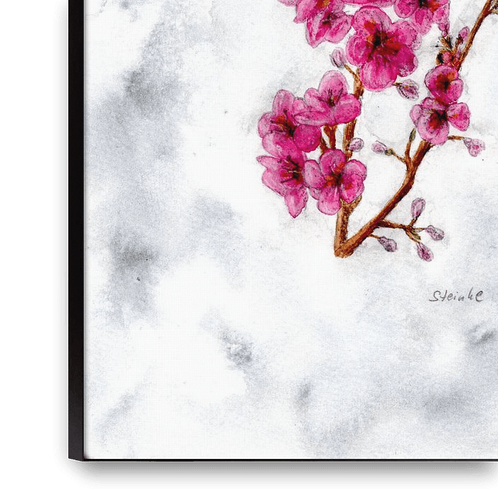 Dit motief toont een aquarel van een kersenbloesemtak in delicate tinten met veel kleine kersenbloesems voor een grijswitte achtergrond, die de prachtige tinten van de afzonderlijke bloesems ondersteunt.