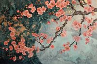 Dit prachtige kunstwerk toont een kersenbloesemtak in volle bloei, geïnspireerd op de traditionele Japanse stijl van Hokusai. De delicate roze bloesems contrasteren prachtig met de donkere, gedetailleerde takken, terwijl de lichtgekleurde achtergrond de hele afbeelding zachtjes benadrukt. Ideaal voor liefhebbers van Aziatische kunst en cultuur die op zoek zijn naar een rustgevend en elegant accent voor hun woon- of meditatieruimte. Dit stuk brengt de rustige schoonheid van de natuur in elke kamer en nodigt je uit om te blijven hangen en te dromen.