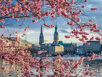 Kersenbloesems in Hamburg, Duitsland langs het Binnenalstermeer met het stadhuis op de achtergrond