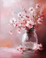 Een glazen pot vol kersenbloesems staat rustig op tafel, badend in zacht licht. De roze achtergrond en het spel van licht en schaduw geven het geheel een bijna dromerige sfeer. Je ziet de penseelstreken, subtiel maar levendig, en de fijne details van de bloemetjes brengen het werk echt tot leven.