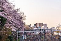 Kersenbloesems over de spoorweg tijdens een zonnige avond in Tokyo, Japan. Roze bloesems met geel blauwe lucht zorgen voor een rustig beeld.