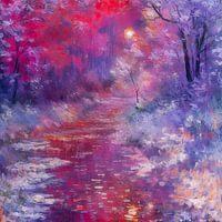 Impressionistisch schilderij met heldere kleuren van Roberto Moro. De bomen aan weerszijden van de rivier zijn bedekt met roze en paarse kersenbloesems, hun takken reiken naar de hemel. De zon schijnt door de bomen en creëert een warme gloed die het tafereel verlicht. De rivier is kalm en stil en weerspiegelt de kleuren van de lucht en de bomen. De algehele sfeer van het schilderij is vredig en sereen.