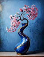 Een compositie in de stijl van een schilderij, met een tak kersenbloesem in een soliflore, waarvan de gebogen lijnen in continuïteit zijn met de kromming van de tak. De harmonie van kleur tussen het diepe blauw van de vaas en het lichtere blauw van de muur op de achtergrond, de harmonie van vorm tussen de lijnen van de tak en die van zijn keramische steun, onderstreept door gouden rondingen, en de aanwezigheid van delicate roze bloemen, creëren een gevoel van rust en klassieke schoonheid.