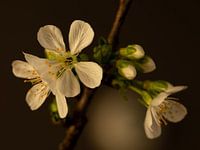 Foto van een tak met bloeiende Kersenbloesem. Donker bruine achtergrond. Op de voorgrond een tak met drie bloeiende bloempjes en drie knopjes van een Kersenbloesem.