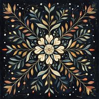 Kerst Bloemmotief - Dit bloemen schilderij toont een symmetrische compositie van ingewikkelde bloemmotieven met bladeren en bessen, uitgewerkt in rustgevende kleuren zoals marineblauw, crèmewit, lichtgroen en accenten van oranje, geplaatst tegen een donkere achtergrond waardoor het een elegante en feestelijke uitstraling krijgt die doet denken aan een kerstsfeer.