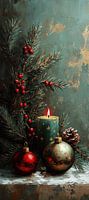 Kerst Decoratie - Dit Kerst schilderij toont een sfeervol stilleven met een brandende groene kaars, glanzende Kerstballen in rood en goud, een dennenappel, en kleine rode bessen tegen een rustige, getextureerde donkergroene achtergrond.