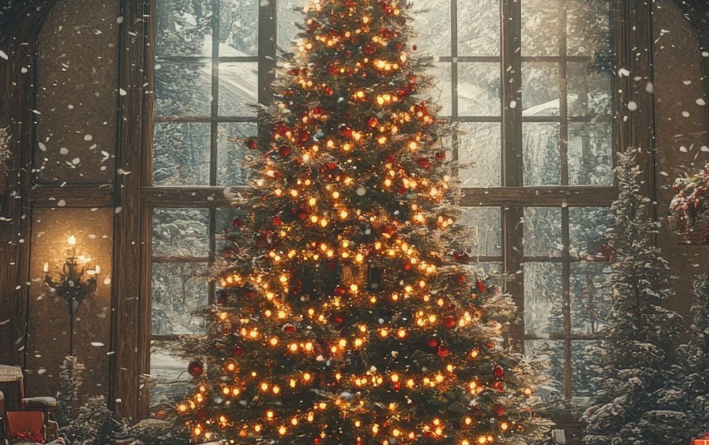 De afbeelding toont een gezellig interieur van een hut die is ingericht voor Kerstmis. Een grote, prachtig versierde kerstboom staat in het midden van de kamer, versierd met twinkelende lichtjes, ornamenten en een gouden ster bovenop. De kamer is gevuld met een warme, uitnodigende sfeer, met een knapperend haardvuur op de achtergrond en sneeuw die zachtjes valt buiten de grote ramen.