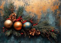 Kerstversiering Kerstglans - Dit kerst schilderij is een samenstelling van glanzende Kerstballen in goud, oranje en blauwe tinten, omringd door dennentakken en rode bessen, tegen een ruwe, abstracte achtergrond in goud en blauwgrijze kleuren die een gevoel van winterse kou uitstraalt.