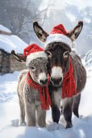 Mama ezel staat met haar veulen in de sneeuw te knuffelen. Ze hebben beide een kerstmuts op en een kerstsjaal om. De sneeuwvlokken dwarrelen naar beneden, ze hebben het niet koud door hun dikke vacht en hun liefde voor elkaar. Het beeld is met behulp van ai gegenereerd.