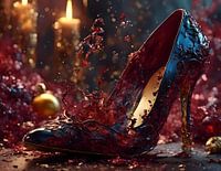 Een donkerblauwe pomp met rode wijn, een kerstkaars en gouden kerstballen op de achtergrond. Pure feestelijke verwachting.