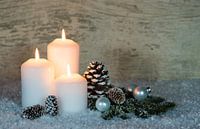 Kerstmis en Adventskaarsen met natuurlijke decoratie en ornamenten op sneeuw en houten achtergrond, exemplaarruimte, Kerstkaart, Kerstmisornamenten, Kerstversiering, groetkaart, Kerstmislicht