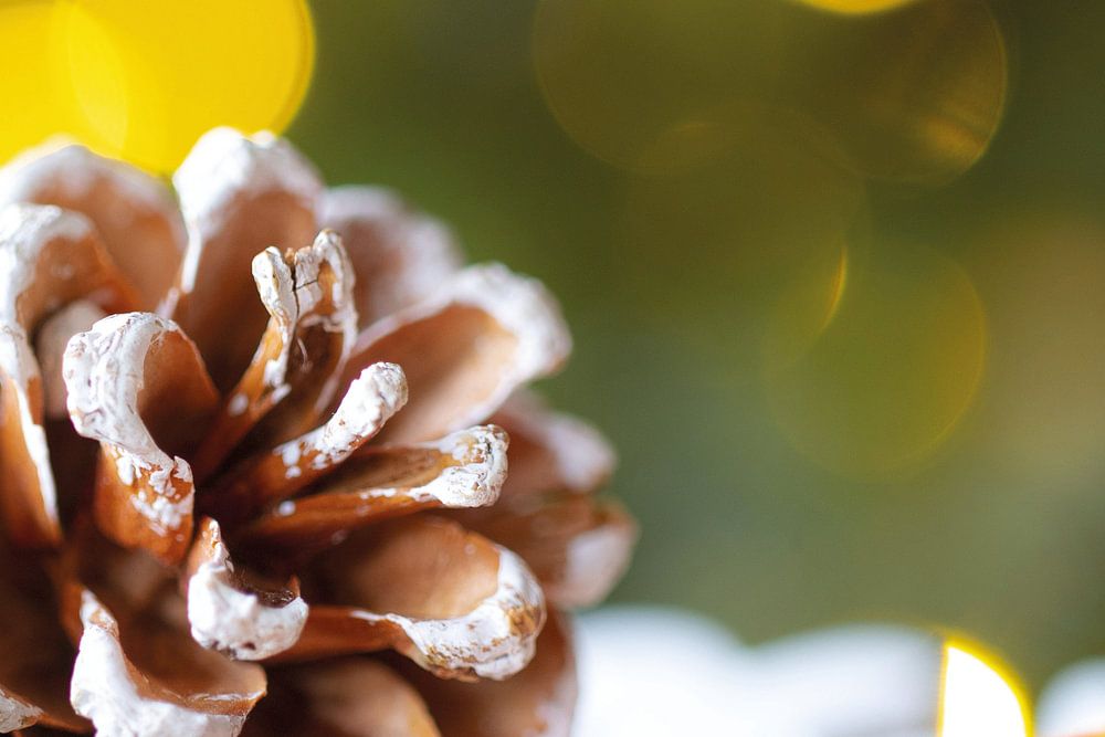 Een dennenappel en de lampion van een lampionplant gefotografeerd in kerstsferen. Met op de achtergrond de zachte feestverlichting.