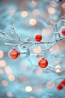 Een feestelijk geheel van glinsterende kerstballen en ijzige takken creëert een magische wintersfeer. De stralende rode en zilveren ornamenten vangen het licht van de fonkelende achtergrondverlichting en geven elke kamer een gezellige, uitnodigende sfeer. Ideaal voor in de woonkamer om de feestvreugde te verspreiden.