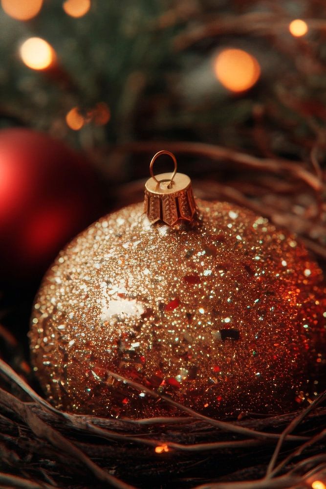 Een stralende gouden kerstdecoratie schittert tussen zachte sparrentakken en rode kerstballen, genesteld in een knus nestje van twijgen. De zachte gloed van de lichtjes creëert een feestelijke sfeer die meteen warmte en vreugde verspreidt. Deze afbeelding is perfect voor de woonkamer en nodigt uit om te dromen en te vieren.