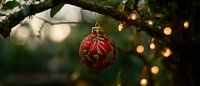 Een felrood kerstboomornament, artistiek versierd, schommelt zachtjes aan een tak, omringd door warm, gouden licht. Dit feestelijke tafereel roept onmiddellijk een gevoel van gezelligheid en feestelijkheid op. Ideaal voor in de woonkamer, het brengt de feestelijke sfeer tot in het hart van het huis en nodigt uit tot dagdromen.