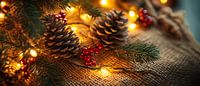 Feestelijk versierde dennenappels en gloeiende lichtjes hullen de foto in winterse warmte. Rode bessen en zacht licht brengen de kijker in een contemplatieve stemming. Ideaal voor een gezellige keuken of een uitnodigende woonkamer, waar de voorpret van de feestdagen voelbaar is. Een vleugje natuur voor de feestdagen!