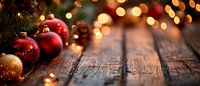Glinsterende kerstballen in warme rode tinten schitteren naast aardse dennenappels, terwijl zacht, gouden licht een feestelijke sfeer oproept. Het rustieke houten oppervlak geeft het arrangement een gezellig tintje. Ideaal voor in de woonkamer om tijdens de feestdagen een uitnodigende sfeer te creëren en mooie herinneringen op te halen met familie en vrienden.