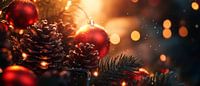 Een magisch winterwonder waarin glinsterende rode kerstballen en fluweelzachte dennenappels zachtjes oplichten in het warme licht. De harmonieuze kleuren en feestelijke sfeer nodigen uit tot dromen en maken deze aanblik perfect voor de woonkamer, waar het een gevoel van gezelligheid en feestelijke verwachting verspreidt.