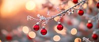 Een vleugje feestelijke magie zweeft door de lucht als felrode kerstballen aan een met vorst bedekte tak bungelen. Het zachte licht van de winterzon geeft het tafereel een warme gloed, ideaal voor een gezellige sfeer in de woonkamer. Hier wordt de vreugde van de feestdagen gecombineerd met de schoonheid van de natuur om een uitnodigende…