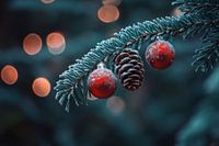Een vleugje wintermagie ontvouwt zich met glanzende rode kerstballen die voorzichtig aan een ijzige sparrentak hangen. Een delicate dennenappel voegt een rustieke flair toe, terwijl wazige lichtjes op de achtergrond een feestelijke stemming oproepen. Dit sfeervolle schilderij is ideaal voor in de woonkamer om de gezelligheid van de feestdagen te benadrukken.