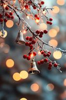 Delicate zilveren belletjes fonkelen op een winterse achtergrond, omlijst door felrode bessen. De warme, zachte lichtjes creëren een feestelijke sfeer die herinneringen oproept aan gezellige vakanties. Dit decoratieve element is ideaal voor de woonkamer, creëert een uitnodigende sfeer en voegt een vleugje magie toe aan elke kamer.
