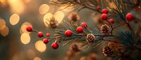 De zachtgroene tinten van de takken harmoniëren perfect met de felrode bessen en glimmende kegels, waardoor een feestelijke sfeer ontstaat. Deze winterse compositie straalt warmte en gezelligheid uit en geeft de woonkamer een uitnodigende charme, ideaal voor ontspannen avonden met vrienden en familie.