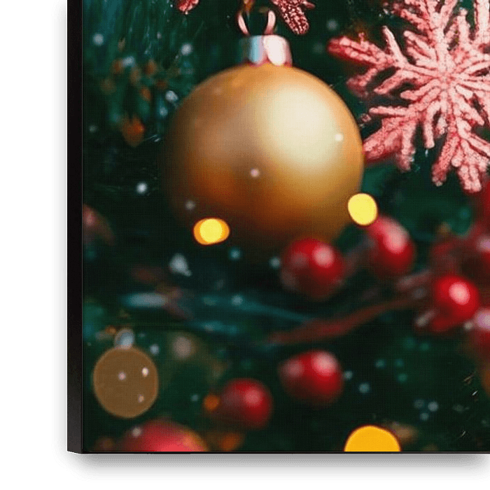 Een feestelijke kerstboom, versierd met gloeiende kerstballen en glinsterende sneeuwvlokken, straalt een warme sfeer uit. De zachte lichtjes in combinatie met de feestelijke gloed creëren een uitnodigende sfeer. Perfect voor de woonkamer om de familie samen te brengen en de voorpret van de feestdagen te delen.