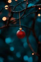 Een fonkelende rode kerstboomhanger hangt aan een subtiele tak, omgeven door een warme gloed van lichtjes. Het tafereel straalt een magische, feestelijke sfeer uit en nodigt je uit om je onder te dompelen in herinneringen aan contemplatieve feestdagen. Ideaal voor in de woonkamer om gezellige avonden en feestelijke voorpret op te roepen.