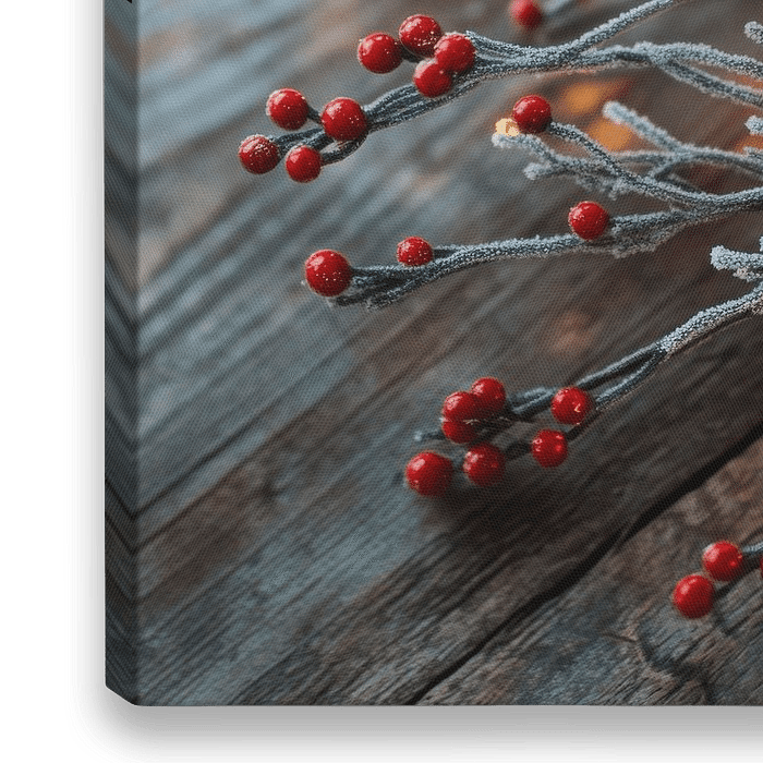 Zachte lichtjes dansen rond tere takken versierd met felrode bessen en spelen harmonieus rond het rustieke hout. Deze warme, uitnodigende sfeer is perfect voor de woonkamer, waar gezelligheid en een feestelijke stemming elkaar ontmoeten. Een echte blikvanger die elke kamer zal opfleuren!