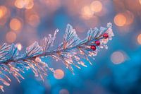 Een filigraan takje, glinsterend van de rijp, glinstert in het zachte licht van een magische winterochtend. De rode bessen voegen kleurrijke accenten toe en geven het beeld een feestelijk tintje. Perfect voor in de woonkamer, waar het gezelligheid en winterse elegantie uitstraalt en het hart verwarmt.