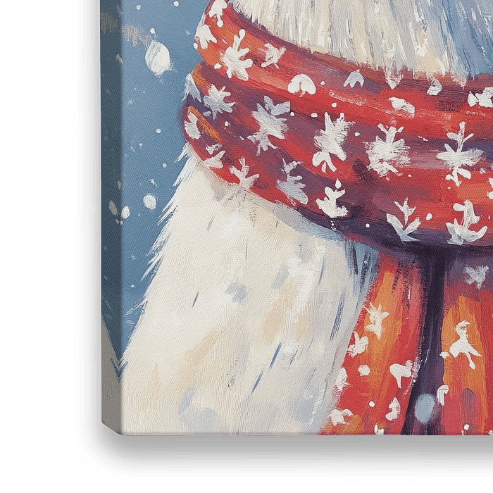 Kerst ijsbeer - Dit dieren schilderij toont een witte ijsbeer met een opvallende rode sjaal versierd met witte sneeuwvlokken, tegen een achtergrond van vallende sneeuw en een koele blauwe lucht.