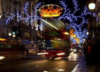 Dubbel dekker bus rijdt door een verlichte Regent Street tijdens Kerstmis in London