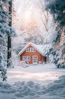 Een gezellig houten huis glinstert midden in een ijzig sprookjeslandschap, omringd door glinsterende sneeuw en besneeuwde bomen. Zachte lichtstralen doordringen de winterse stilte en het warme kleurenschema van het huis straalt een gevoel van geborgenheid uit. Ideaal voor in de woonkamer, waar het uitnodigt tot een gesprek onder het genot van een kopje thee.