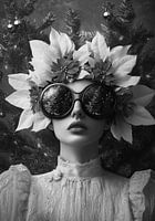 De vrouw draagt een verfijnde, witte kanten blouse die haar uitstraling een tijdloze elegantie geeft. Haar haar is versierd met een prachtige mengeling van witte en grijze kerststerren, die haar een bijna etherische uitstraling geven, alsof ze de incarnatie is van de kerstgeest zelf. De bloemen stralen warmte uit en vormen een mooi contrast met de koele, winterse sfeer rondom haar. Haar look is verder compleet met de bril, die haar ogen afschermt en haar gezicht een mysterieuze allure geeft, maar tegelijkertijd de feestelijke elementen van haar omgeving benadrukt.