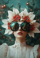 De vrouw draagt een verfijnde, witte kanten blouse die haar uitstraling een tijdloze elegantie geeft. Haar haar is versierd met een prachtige mengeling van witte en rode kerststerren, die haar een bijna etherische uitstraling geven, alsof ze de incarnatie is van de kerstgeest zelf. De bloemen stralen warmte uit en vormen een mooi contrast met de koele, winterse sfeer rondom haar. Haar look is verder compleet met de bril, die haar ogen afschermt en haar gezicht een mysterieuze allure geeft, maar tegelijkertijd de feestelijke elementen van haar omgeving benadrukt.