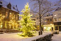 Kerst op de Nieuwe Markt in Zwolle met sneeuw bedekte grond, decoratie lichten en een kerstboom tijdens een koude winteravond in december.