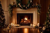 Een laaiend vuur straalt in een magische sfeer, omlijst door feestelijke decoraties en geurige kaarsen. Groen dennenhout en gouden accenten creëren een warme, uitnodigende sfeer. Dit beeld is perfect voor de woonkamer om gezelligheid en feestelijke glamour te verspreiden op koude winteravonden.