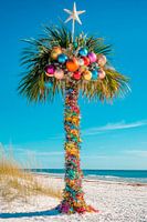 Een straal exotische zonneschijn: een prachtig versierde palmboom glinstert met kleurrijke ornamenten en een stralende ster, terwijl de helderblauwe lucht en het fijne zandstrand een vakantiesfeer creëren. Dit levendige kunstwerk zou een vrolijke toevoeging zijn aan elke woonkamer die gezelligheid en reislust wil uitstralen.