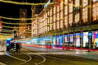 Lichtstrepen van een voorbij rijdende tram die de Bijenkorf passeert aan de Dam, Amsterdam. Opname gemaakt met een lange sluitertijd tijdens de kerst periode met sfeervolle straatverlichting en uitzicht op het Damrak en de beurs van Berlage.