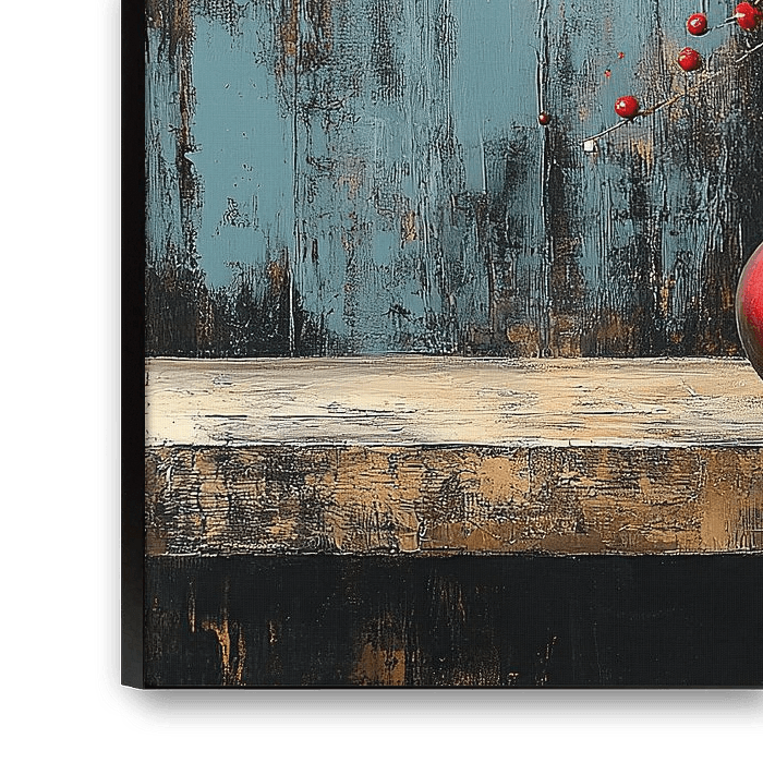 Kerst | Rode Kerst met Blauwe Vaas - Dit Kerst schilderij toont een stilleven met een grote blauwe vaas op een houten plank, gevuld met takken waarop rode besjes zitten, naast twee rode kerstballen, tegen een achtergrond van afgebladderde blauwe en grijze verf.