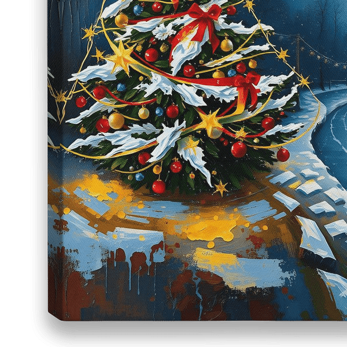 Dit expressieve schilderij vangt de magie van een winteravond waarin licht en duisternis elkaar ontmoeten. Op de voorgrond straalt een rijk versierde kerstboom, met gouden sterren, rode linten en kleurrijke ornamenten, als een baken van warmte tegen het koele blauw van het landschap. De krachtige penseelstreken en gelaagde verfstructuur…