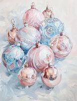 Kerstballen | Feeërieke Kerstballen - Dit kerst schilderij toont een verzameling glanzende kerstballen in zachte pasteltinten, waaronder roze en blauw, die speels reflecteren en een feestelijke sfeer uitstralen.