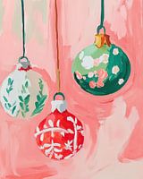 Kerstballen | Feestelijke Kerstballen - Dit Kerst schilderij toont drie kleurrijke kerstballen hangend tegen een zacht roze achtergrond, met sierlijke decoraties in wit en groen op de oppervlakken van de ballen.