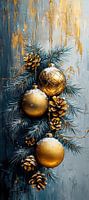 Kerstballen | Glanzende Kerstdecoratie Stilleven - Dit kerst schilderij toont een groep glanzende kerstballen en dennenappels, omringd door sneeuwbedekte dennenbladeren tegen een abstracte grijze en gouden achtergrond, waardoor een gevoel van winterwonder wordt uitgestraald.