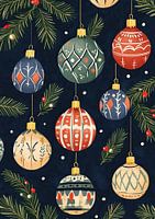 Kerstballen | Kerstballen Kunst - Dit kerst schilderij toont diverse kleurrijke kerstballen, elk met unieke patronen, hangend tussen donkergekleurde dennentakken op een diepblauwe achtergrond, afgewisseld met kleine sneeuwvlokjes en rode besjes.