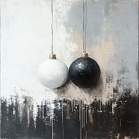 Kerstballen | Zwart en Wit Bal - Dit kerst schilderij toont twee hangende kerstballen, een in glanzend zwart en een in mat wit, tegen een abstract, textuurrijk, grijs-zwart achtergrond die subtiele penseelstreken en druipende verf effecten heeft.