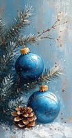 Kerstblauw - Dit kerstschilderij toont een tak van een dennennaaldboom versierd met twee opvallende blauwe kerstballen en een natuurlijke dennenappel, allen bedekt met spetters van sneeuw tegen een koele blauwe achtergrond.